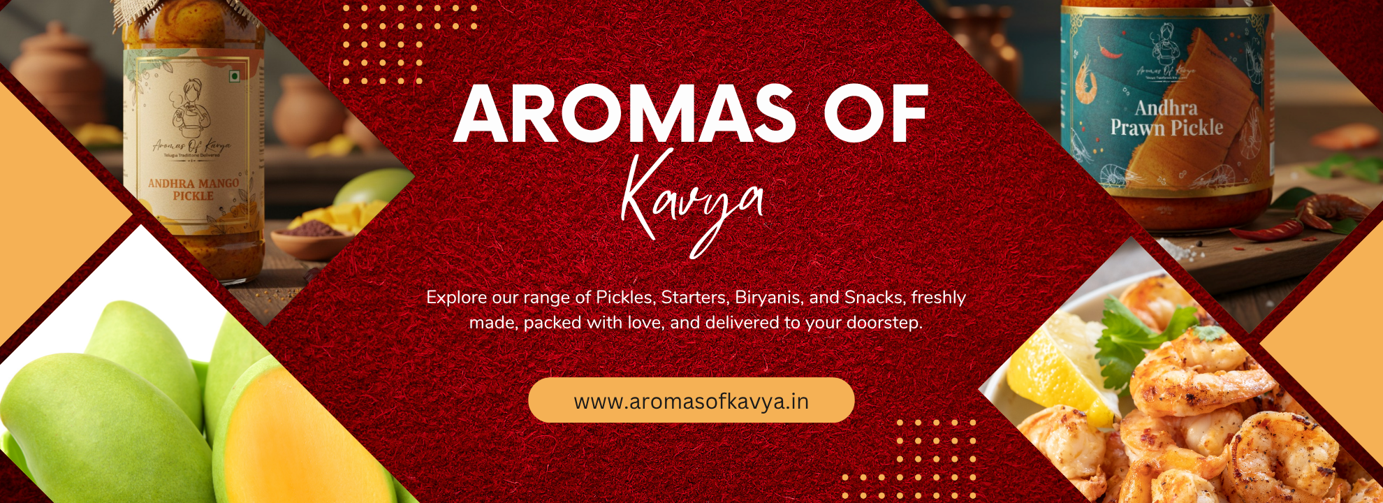 At Aromas of Kavya, every bite tells a story — a story of authentic flavors, handcrafted recipes, and homemade goodness passed down through generations.